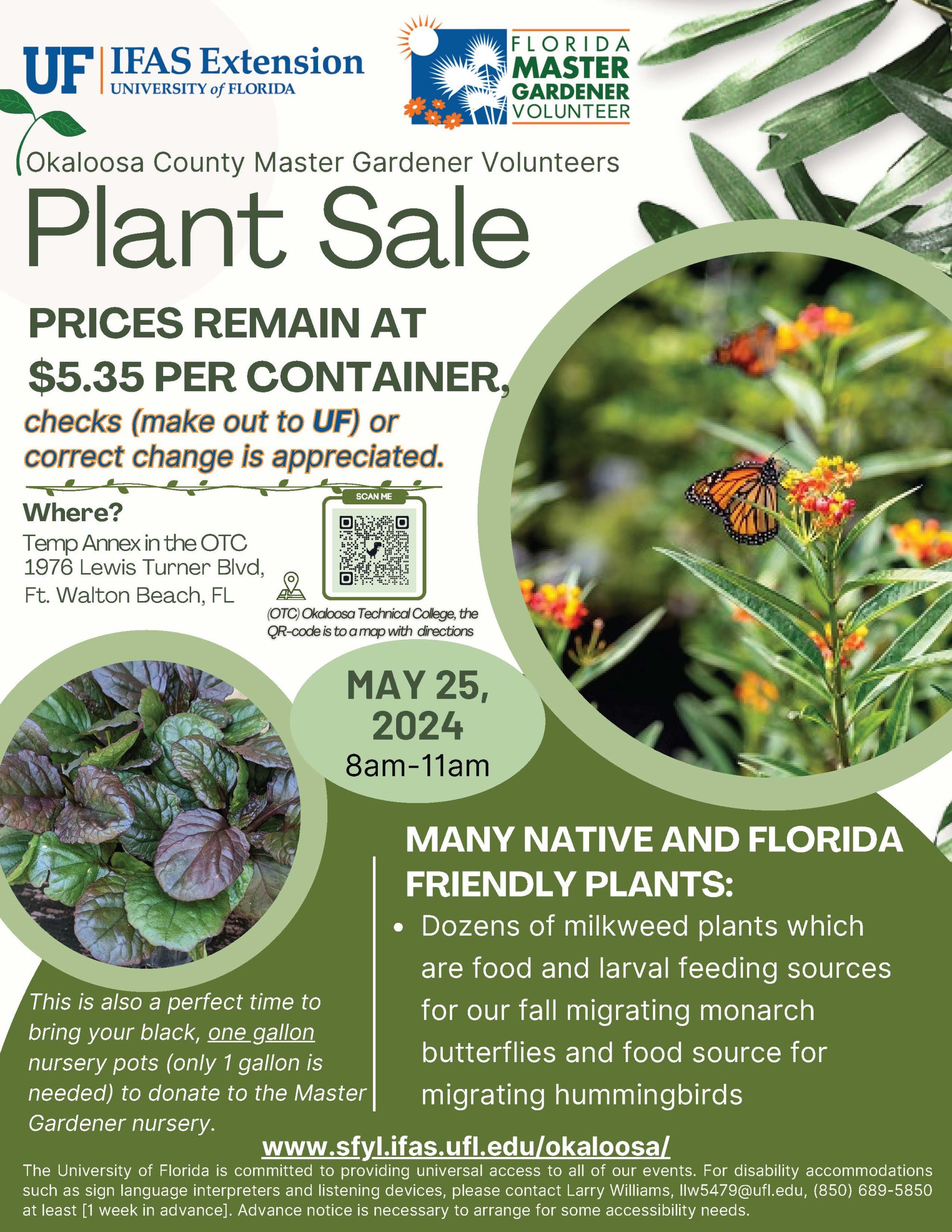 The UF/IFAS Okaloosa County Master Gardener Volunteers will hold their 2024 Spring Plant Sale 8 to 11 a.m. on Saturday, May 18 at the temporary UF/IFAS Extension Annex located at the Okaloosa Technical College (OTC) in Fort Walton Beach. The address is 1976 Lewis Turner Boulevard.