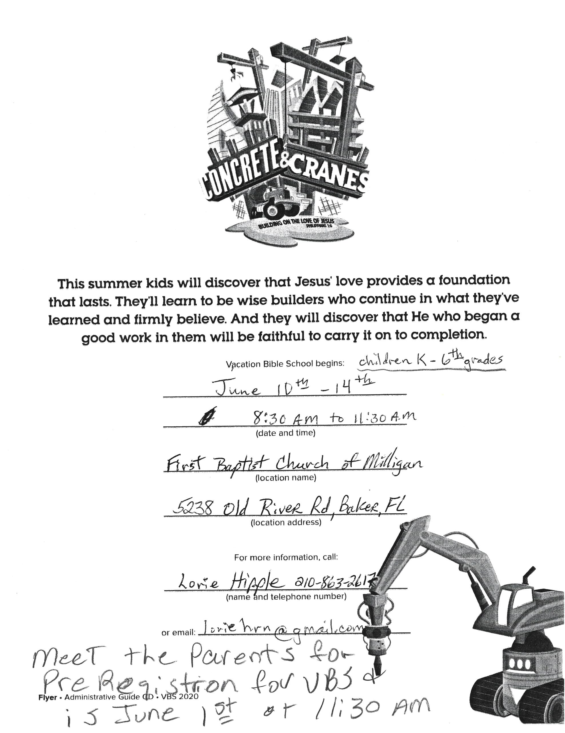 Milligan, Fla. — The 1st Baptist Church of Milligan will be holding Vacation Bible School June 10th – 14th for children in kindergarten through 6th grade.