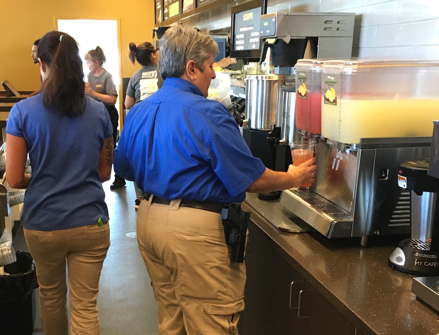 “They’re working out OK,” McAlister’s general manager Kat Gonzalez said of her temporary waitstaff in blue. “We’re glad to be part of this.”.