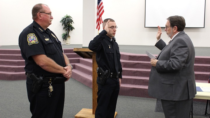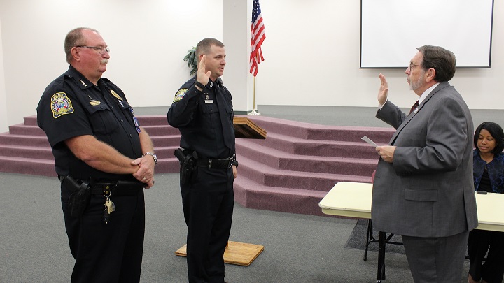 Crestview, FL — In a short Warriors Hall ceremony Wednesday morning, Mayor David Cadle swore in two new Crestview Police officers, including a cadet currently completing the law enforcement academy at Northwest Florida State College’s Criminal Justice program and a former U.S. Air Force MP.